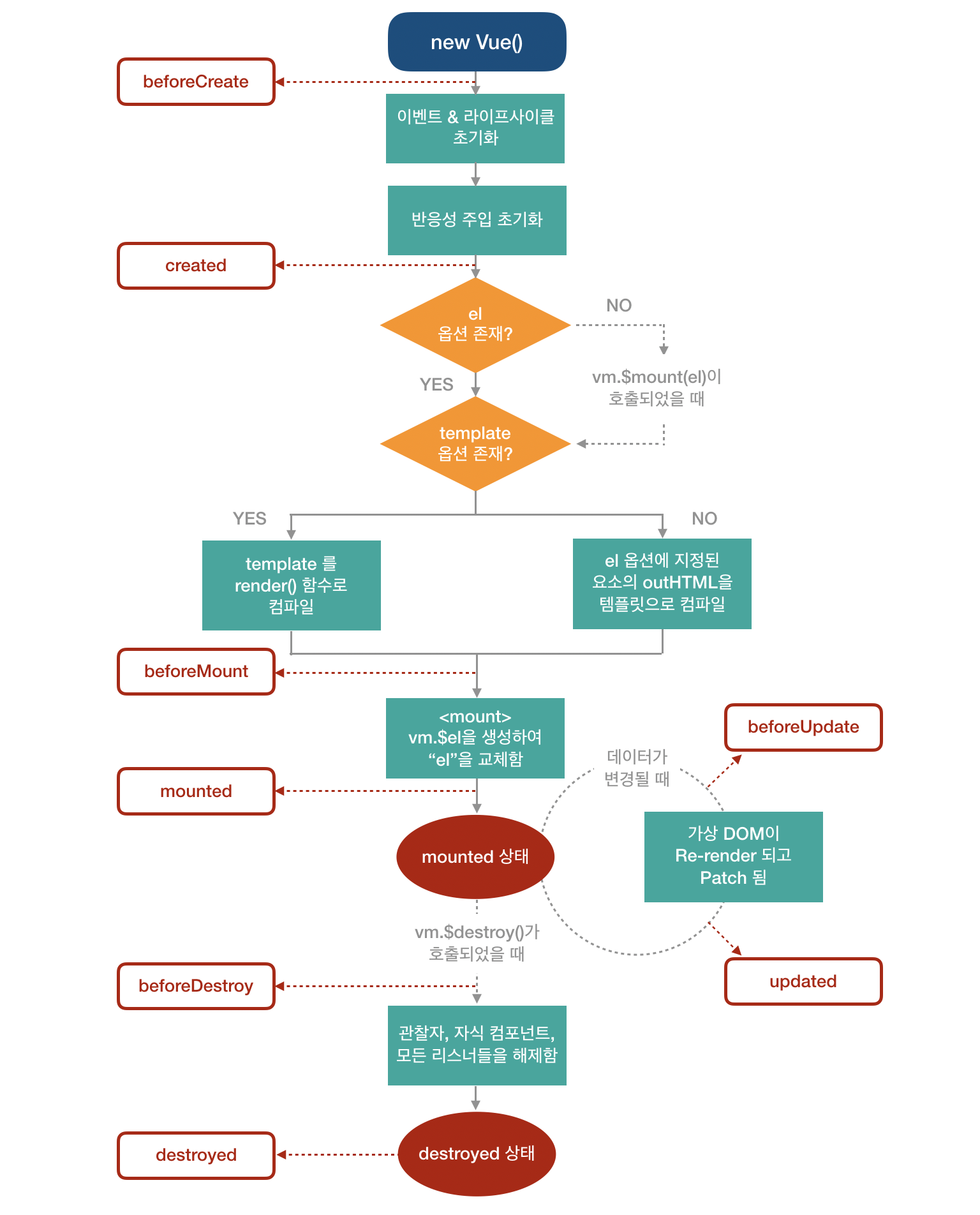 | mounted | el 속성에서 지정한 화면 요소에 인스턴스가 부탁되고 나면 호출되는 단계로, template 속성에 정의한 화면 요소(돔)에 접근할 수 있어 화면 요소를 제어하는 로직을 수행하기 좋은 단계이다. 다만, 돔에 인스턴스가 부착되자마자 바로 호출되므로 하위 컴포넌트나 외부 라이브러리에 의해 추가된 화면 요소들이 최종 HTML 코드로 변환되는 시점과 다를 수 있다. (DOM이 메모리에 생성되고 렌더링 된 이후에 실행됨) (vm.$nextTick으로, 전체 렌더링 상태를 보장할 수 있음.child가 있을 경우, child 컴포넌트의 mounted를 기다린 후에, 실행) |